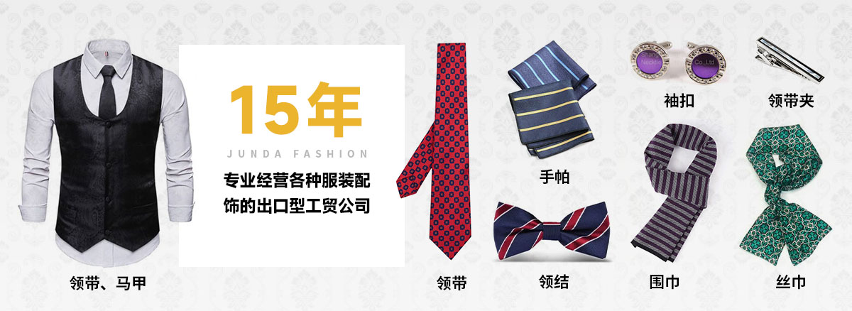 上饒市駿達服飾有限公司是一家專業經營各種服裝配飾的出口型工貿公司,公司多年來致力各種男女服裝國際流行配飾的開發和生產,主要產品為領帶、領結、絲巾、圍巾、手帕、馬甲、背心、箱包皮具、領帶夾、袖扣等,有豐富的內外銷經驗及廣泛的國內外銷售渠道,生產基地管理嚴格,質量過硬,并有一批生產加工企業長期合作